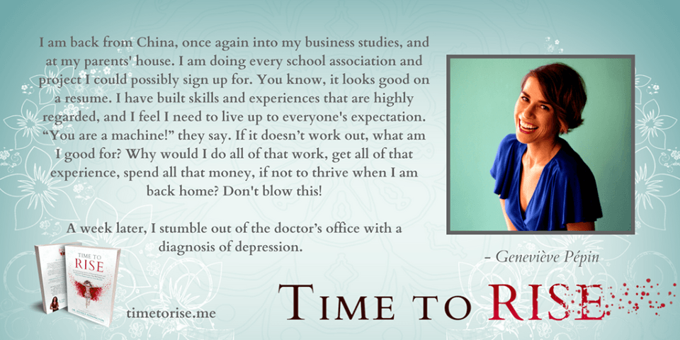 Geneviève’s story in Time to Rise is her first-hand account of pushing herself to her very limits. As with all of us who overachieve, there came a breaking point. With a diagnosis of high-functioning depression, the realization that she was her own harshest critic set in.